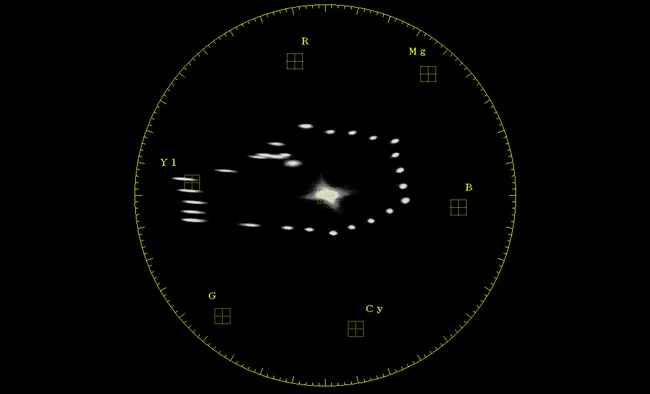 You can tell these images are properly white balanced because the neutral information is exactly in the center of the scope. On the left is an image with enhanced color saturation. The vectors are approaching the edge of the circle and the colors are extremely saturated, our Yellow has actually wandered "out of gamut" and is no longer broadcast legal. On the right is a very de-saturated image whose color information is close to the neutral center of the circle.