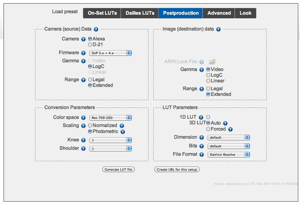 2. Arri Log to Video Linearization 3D LUT choice: Legal to Legal, Legal to Extended, Extended to Legal, or Extended to Extended. Note: while you certainly can use any LUT of your choice as your starting point, even one you custom created, these Arri LUT's are universally used in Alexa post production and in most dailies software so by using them on-set, you're one step closer to closing the gap. An exception to this might be starting your painting with a specific film emulation LUT as specified by the post production facility.